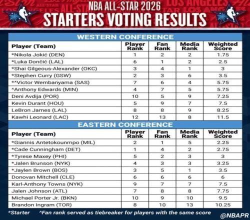 約基奇憑借球員投票西部第一,球迷投票和媒體投票都是西部第二,總分1.75分排名西部第一。東契奇球員投票西部第六,球迷投票西部第一,媒體投票西部第二,總分2.5分排名西部第二。亞歷山大球員投票西部第三,球迷投票西部第四,媒體投票西部第一,總分3.0分排名西部第三。
